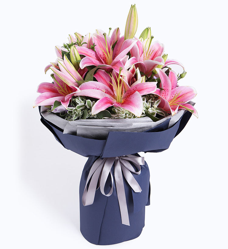 材 料:多头粉香水百合5枝,搭配适量叶上花